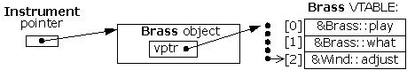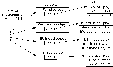 The problem with Instrument2.cpp can be seen by running the program. The output is Instrument::play. This is clearly not the desired output, because you happen to know that the object is actually a Wind and not just an Instrument. The call should produce Wind::play. For that matter, any object of a class derived from Instrument should have its version of play( ) used, regardless of the situation.