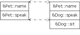 When you use dynamic_cast, you must be working with a true polymorphic hierarchy – one with virtual functions – because dynamic_cast uses information stored in the VTABLE to determine the actual type. Here, the base class contains a virtual destructor and that suffices. In main( ), a Cat pointer is upcast to a Pet, and then a downcast is attempted to both a Dog pointer and a Cat pointer. Both pointers are printed, and you’ll see when you run the program that the incorrect downcast produces a zero result. Of course, whenever you downcast you are responsible for checking to make sure that the result of the cast is nonzero. Also, you should not assume that the pointer will be exactly the same, because sometimes pointer adjustments take place during upcasting and downcasting (in particular, with multiple inheritance).