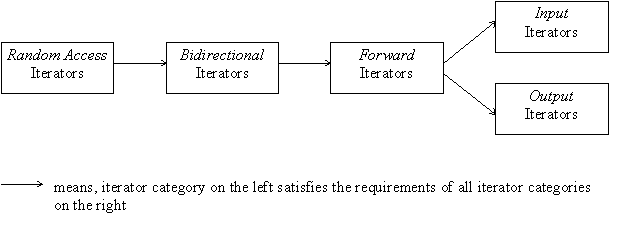 There are five categories of iterators. Iterators differ in the operations defined on them. Each iterator is designed to satisfy a well-defined set of requirements. These requirements define what operations can be applied to the iterator. According to these requirements the iterators can be assigned to the five categories. Iterator categories can be arranged from left to right to express that the iterator category on the left satisfies the requirements of all the iterator categories on the right (and so could be called more powerful).